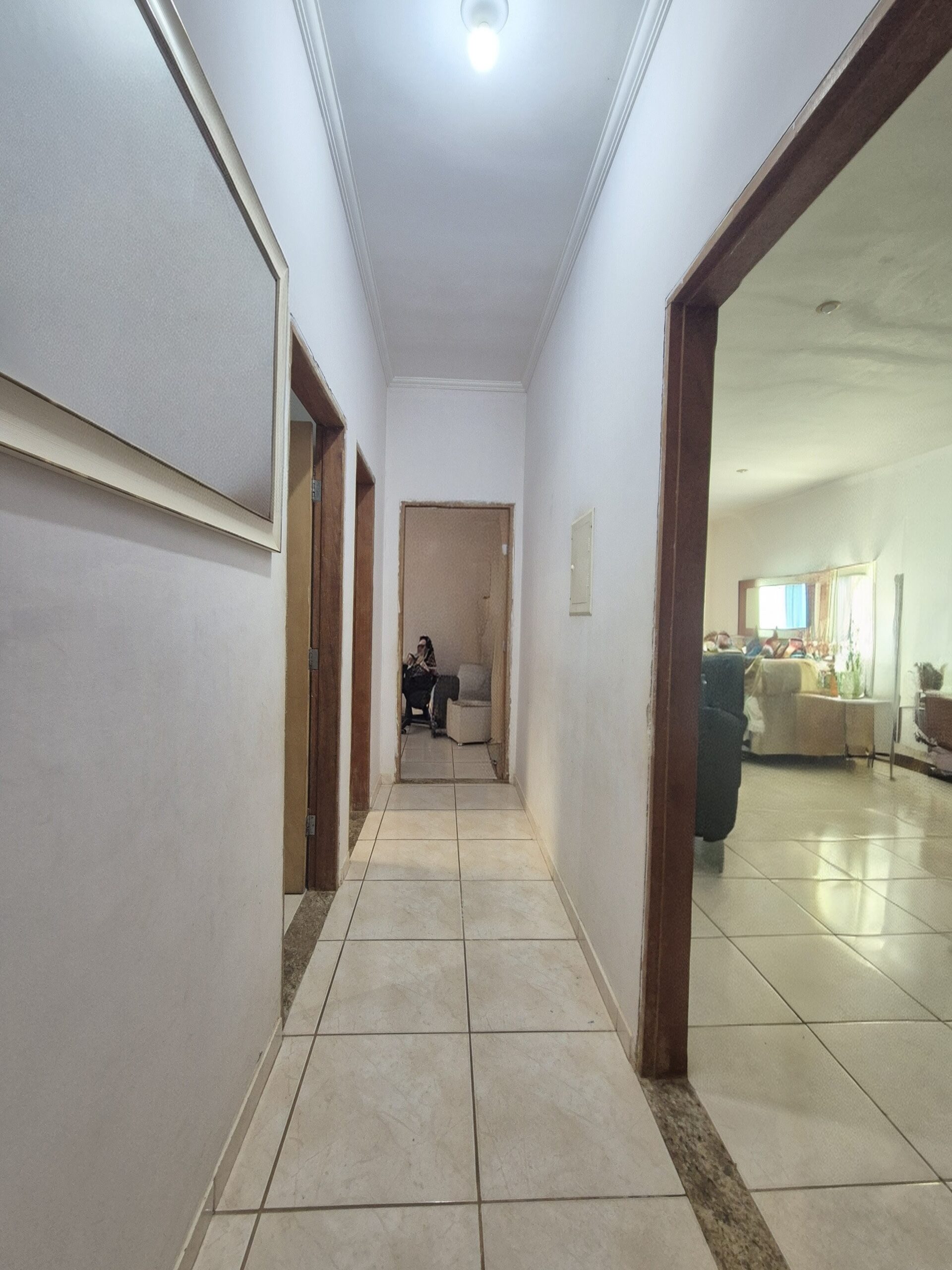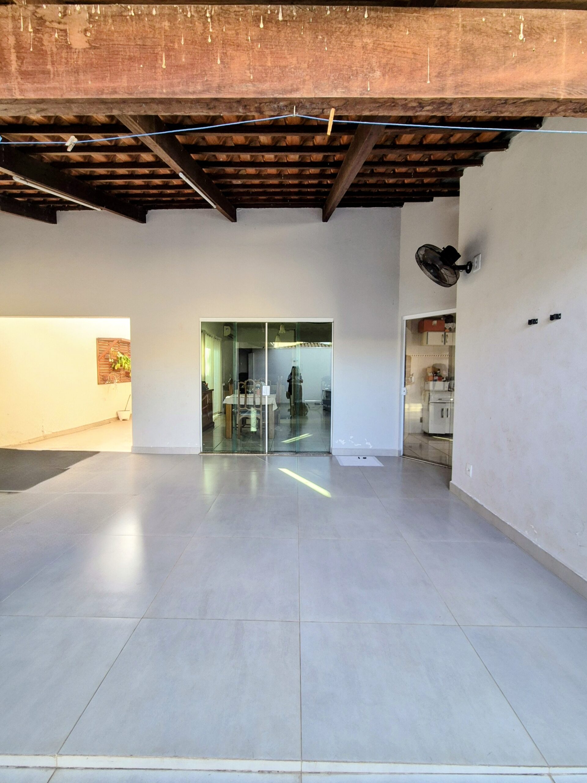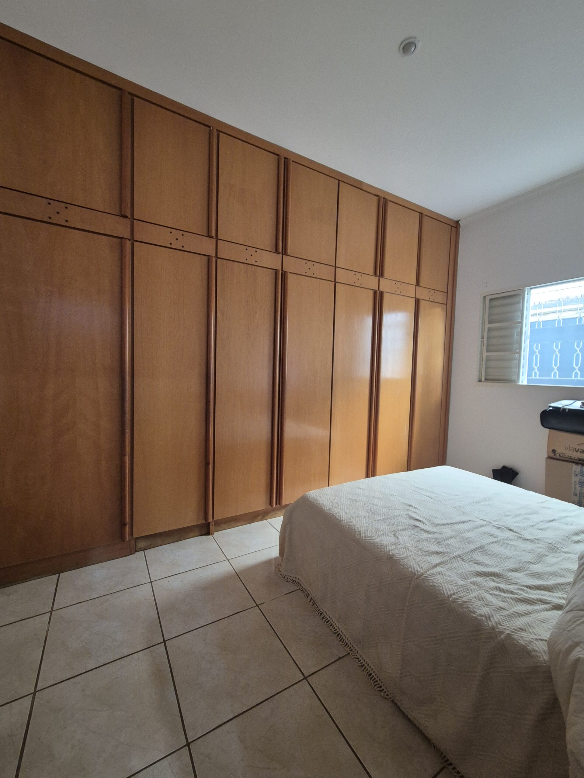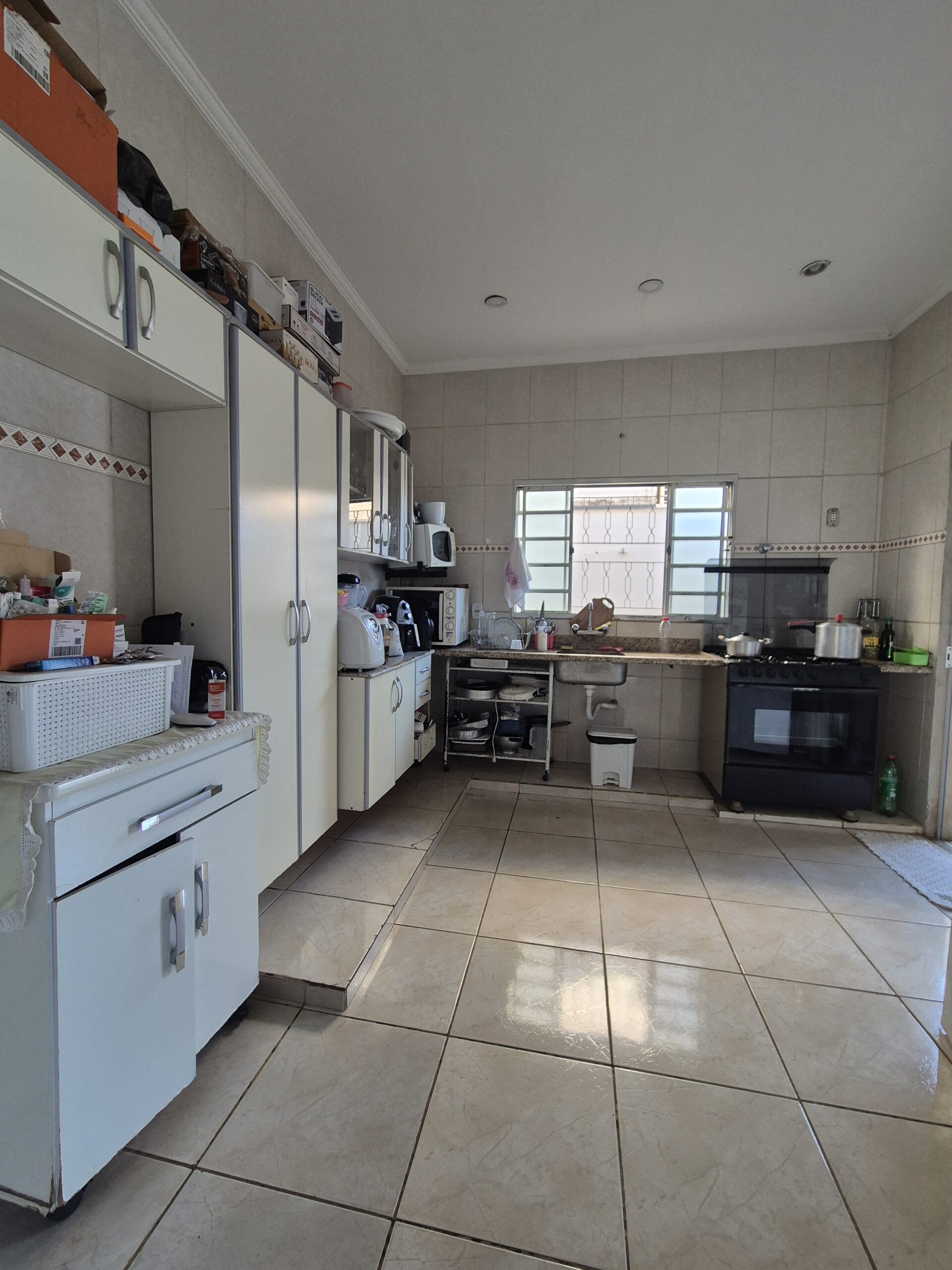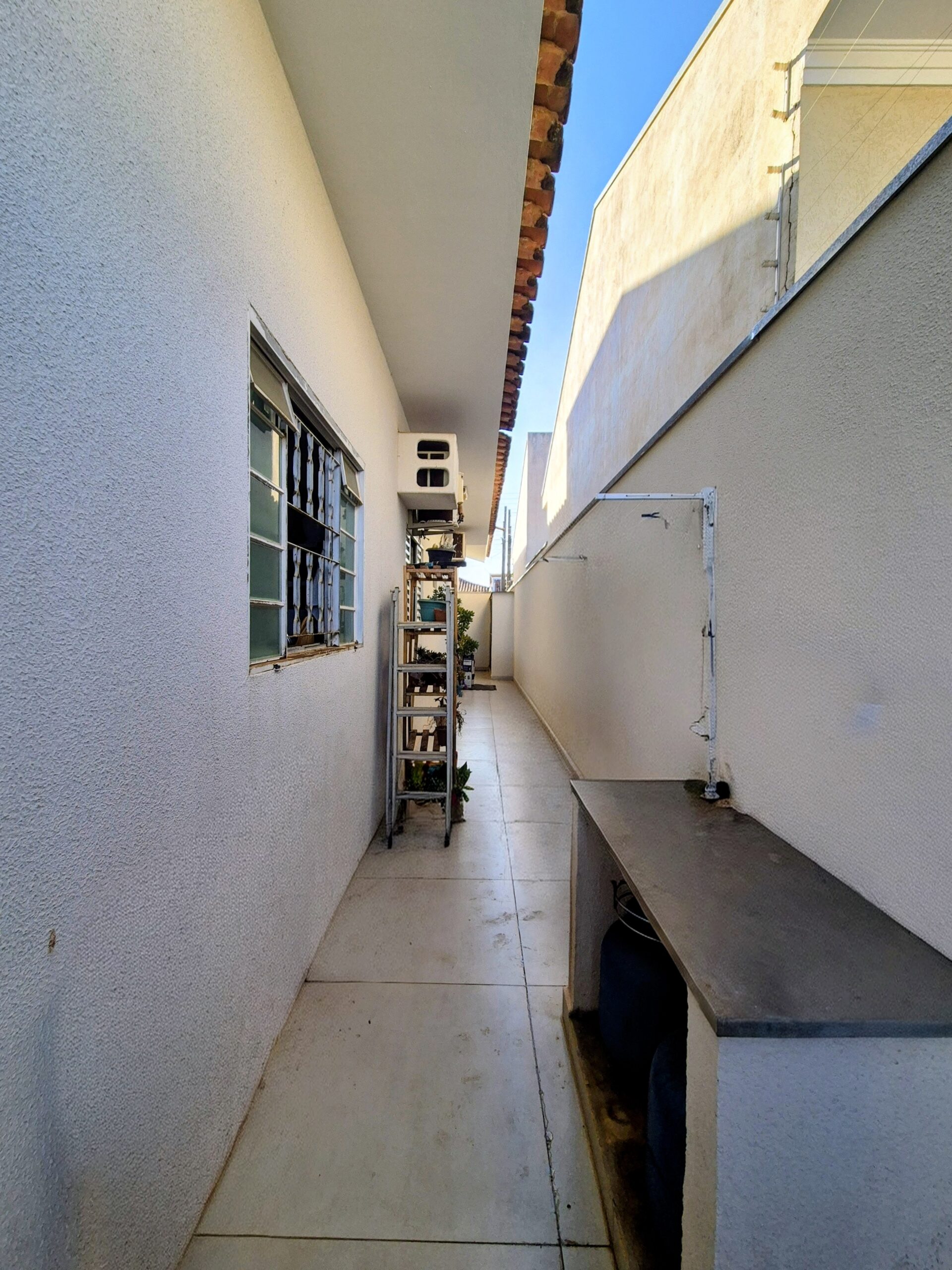 03 dormitórios (1 suíte com armário), sala 2 ambientes, cozinha, escritório, WC social, área externa com churrasqueira e WC de apoio. Banheiros com box blindex e pia de mármore; piso cerâmico; corredores laterais.